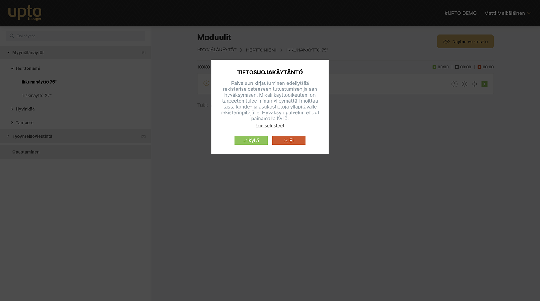 Mikäli käytät Upto Manageria ensimmäistä kertaa, tulee sinun tutustua rekisteriselosteeseen. Mikäli haluat jatkaa Upto Managerin käyttöä, tulee sinun hyväksyä rekisteriseloste.