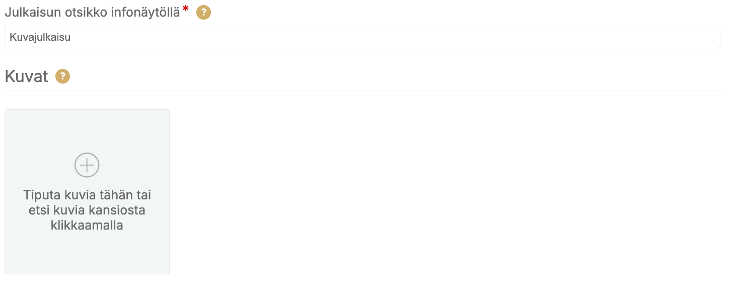 Kuvat kohtaan voit joko raahata kuvan tai voit etsiä kuvia kansioistasi ”Tiputa kuvia tähän tai etsi kuvia kansiosta klikkaamalla” -painikkeesta.