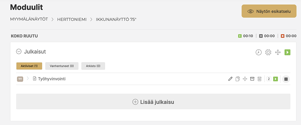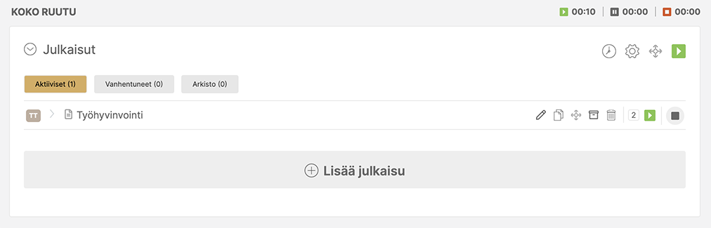 Aktiiviset välilehdellä on kaikki sellaiset julkaisut, joilla ei ole ajastusta, ajastukset ovat voimassa tai ajastukset ovat tulevaisuudessa.