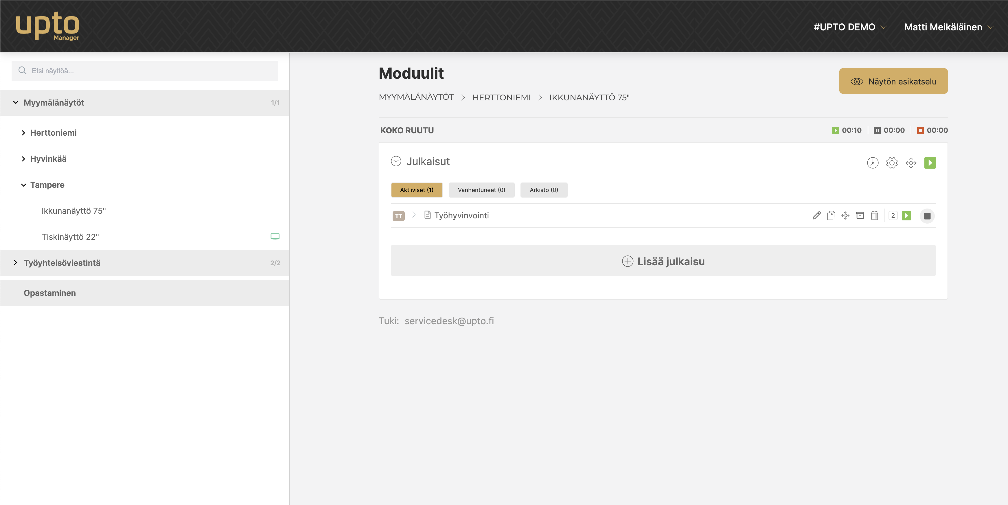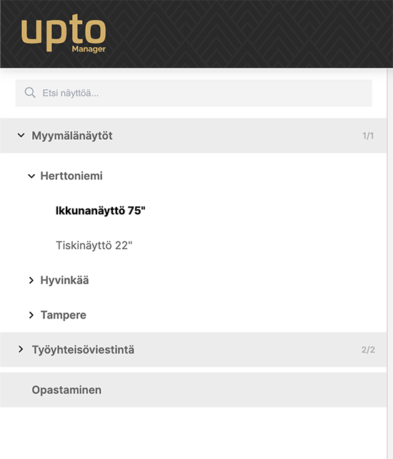 Klikkaamalla Herttoniemi, avautuu hierarkian viimeinen taso. Tässä tapauksessa se on Ikkunanäyttö 75". Ikkunanäyttö 75" on siis fyysinen näyttö. Fyysisen näytön tunnistaa myös siitä, että nimen perässä on joko vihreä tai punainen indikaattori.