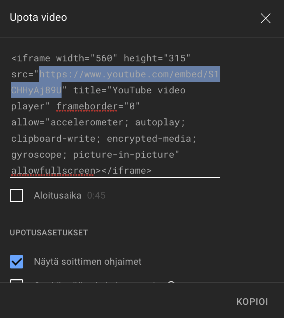 3. Kopioi upotuskoodin joukosta HTML osoite, joka on useasti kahden